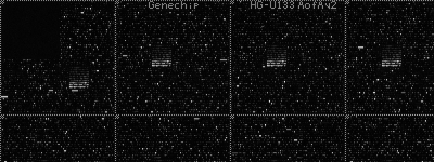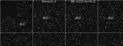 Footnote: (*) The evidence for this comes from comparing spatial images of a CEL file with U133AAofAv2 [PNG] in the header with one with HT_HT-U133A [PNG]. Both have the same spatial patterns, i.e. blocks of checkered blocks and control probes, "landing lights", and positive controls spelling out 'GeneChip' and 'HG-U133 AofAv2'.